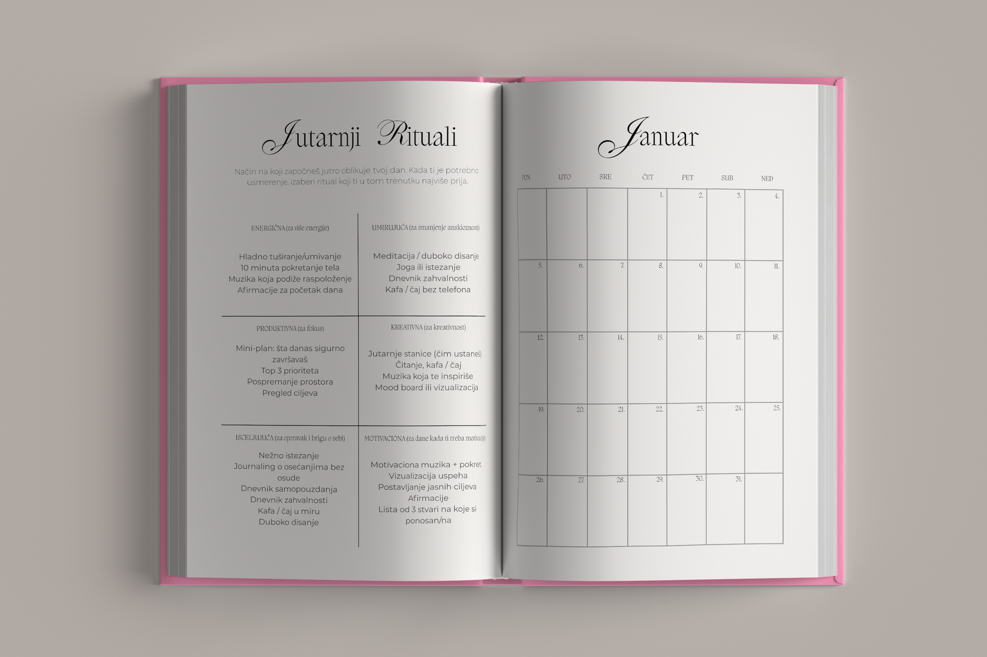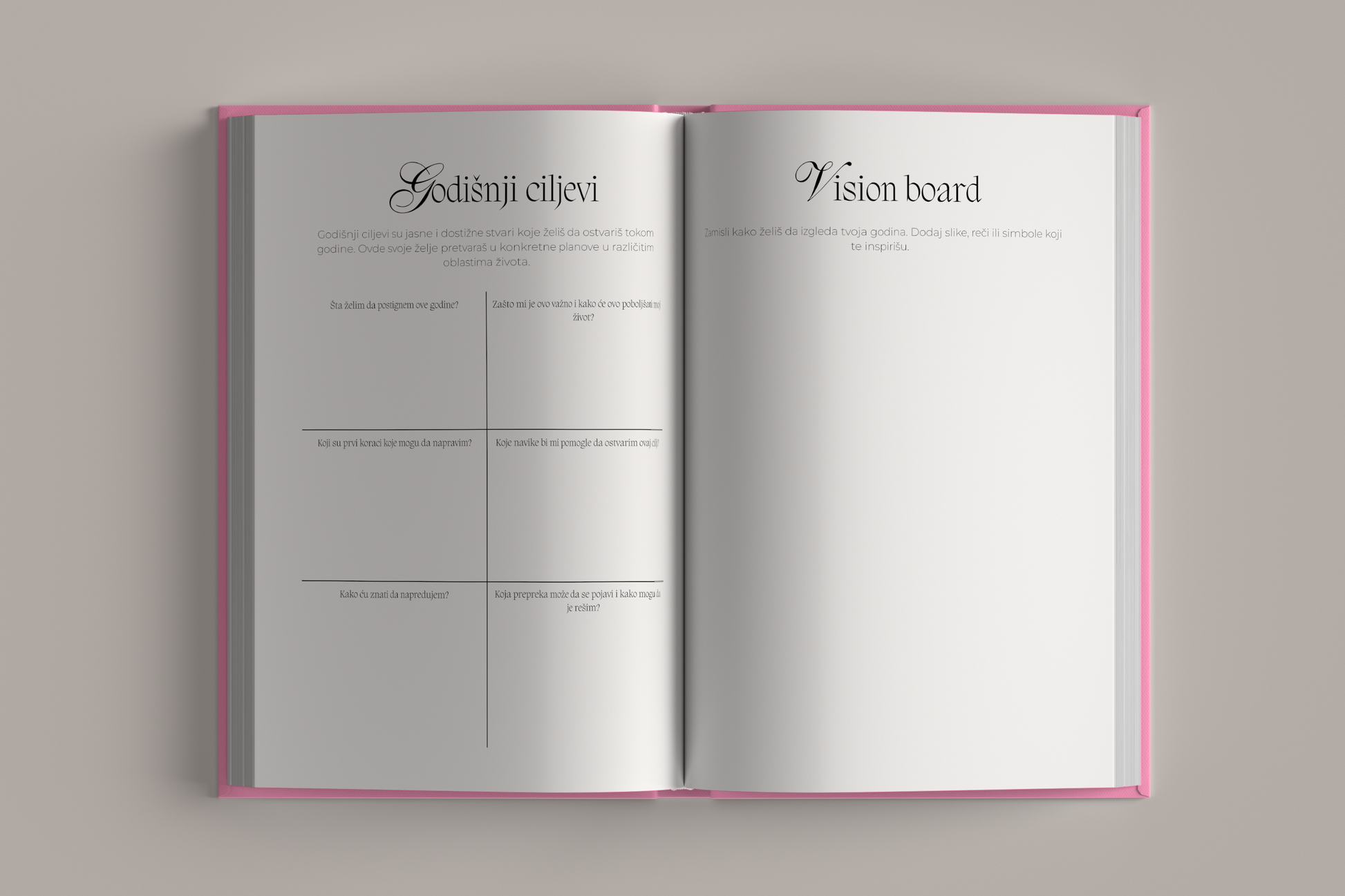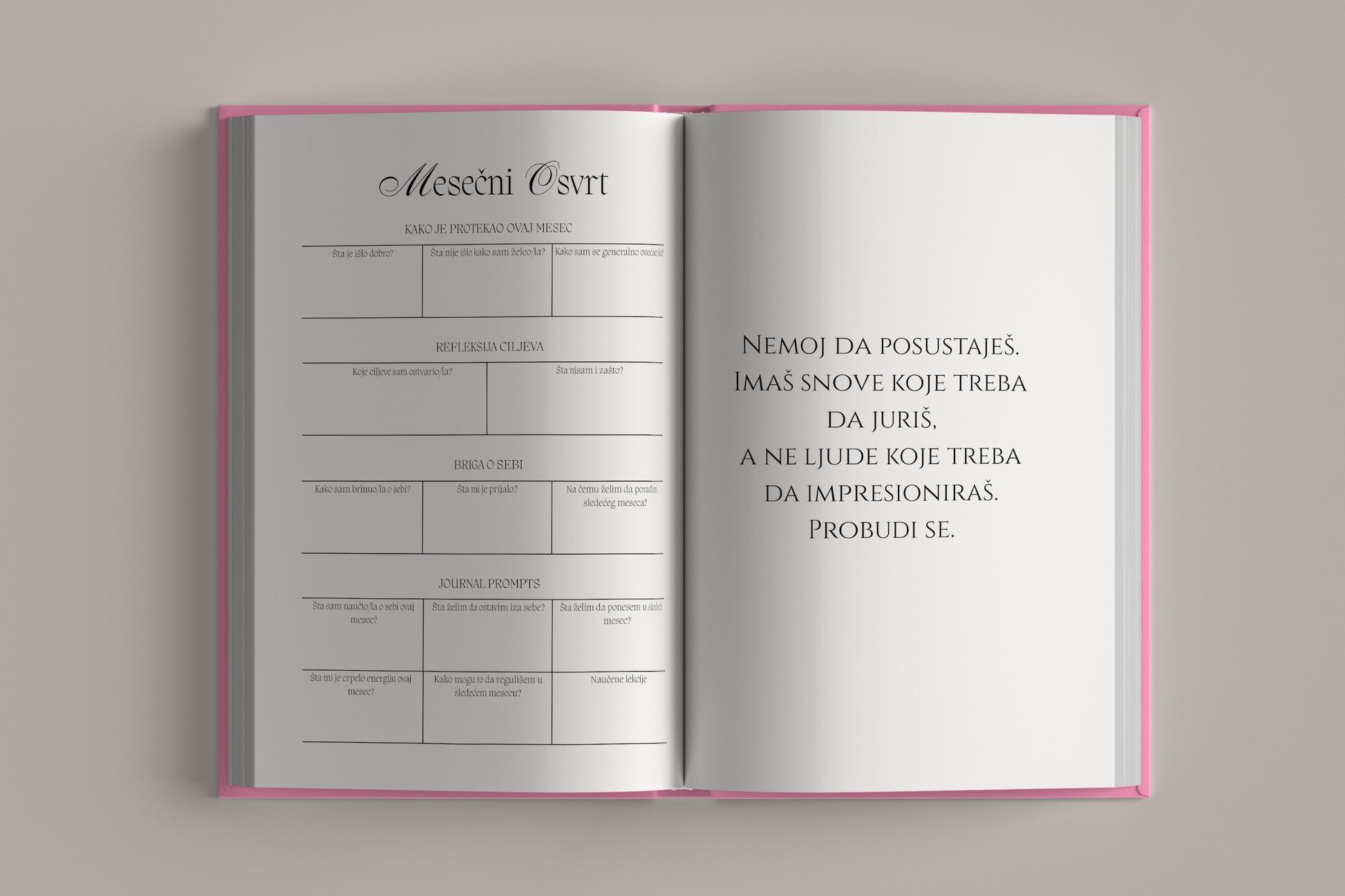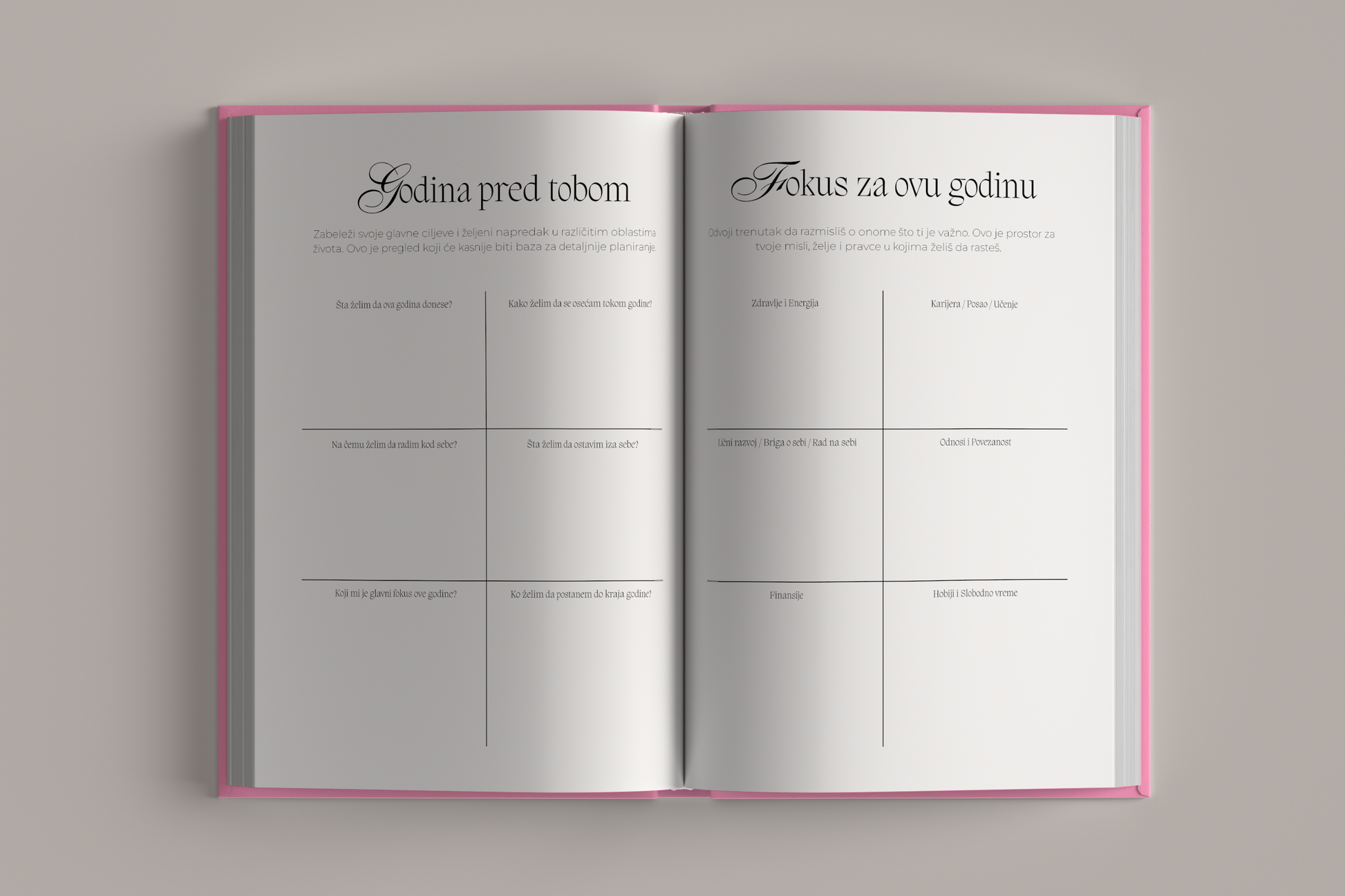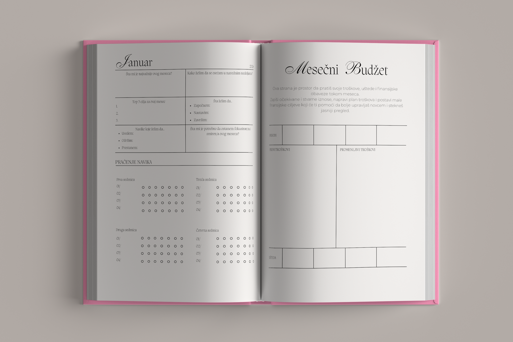Planer te vodi kroz godinu korak po korak. Svaki mesec započinješ postavljanjem namere, a završavaš refleksijom koja ti pomaže da sagledaš svoj napredak, energiju i prioritete.